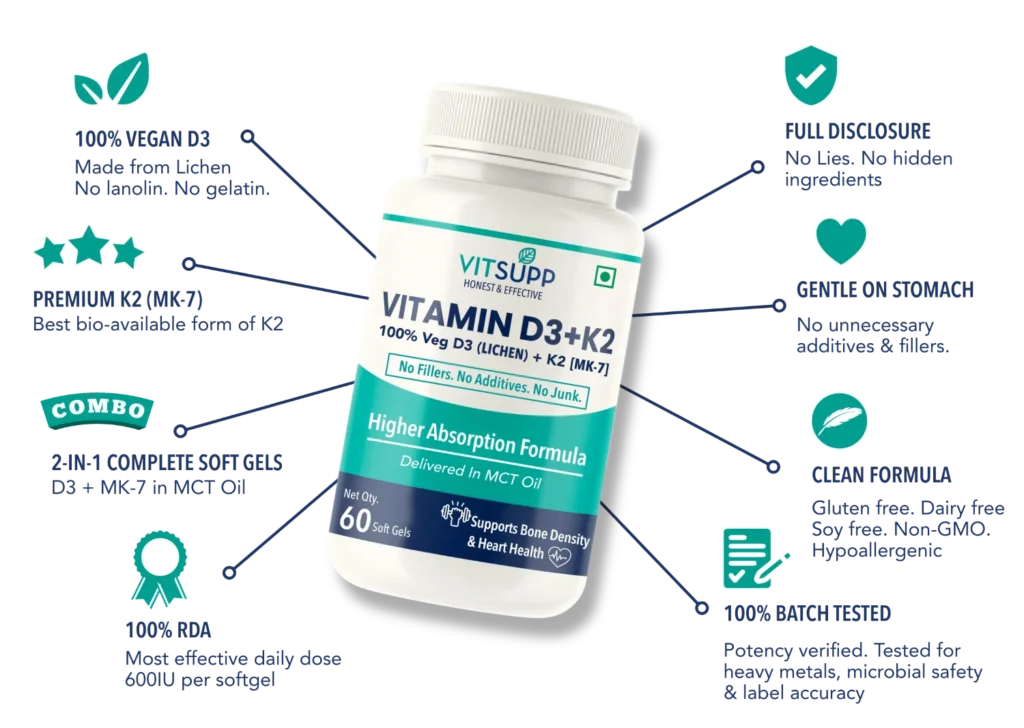 MK-4 and MK-7 are two forms of Vitamin K2, but they behave differently in the body. MK-7 (menaquinone-7) stays active in the bloodstream for much longer, allowing for consistent support with once-daily dosing. MK-4, on the other hand, has a shorter half-life and often requires higher or more frequent doses to maintain similar effects. Because of its longer duration and better bioavailability, it is better to opt for one of the best vitamin D3 and K2 supplements in India- like an MK-7 fortified supplement, like from VitSupp. Our supplements use the best and the most absorbable forms of these essential nutrients, which serve well for your daily vitamin D3 supplementation. Our products are 100% vegetarian and clean, which makes them the best choice.
